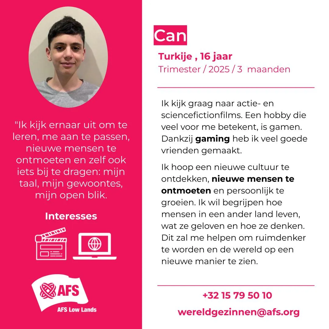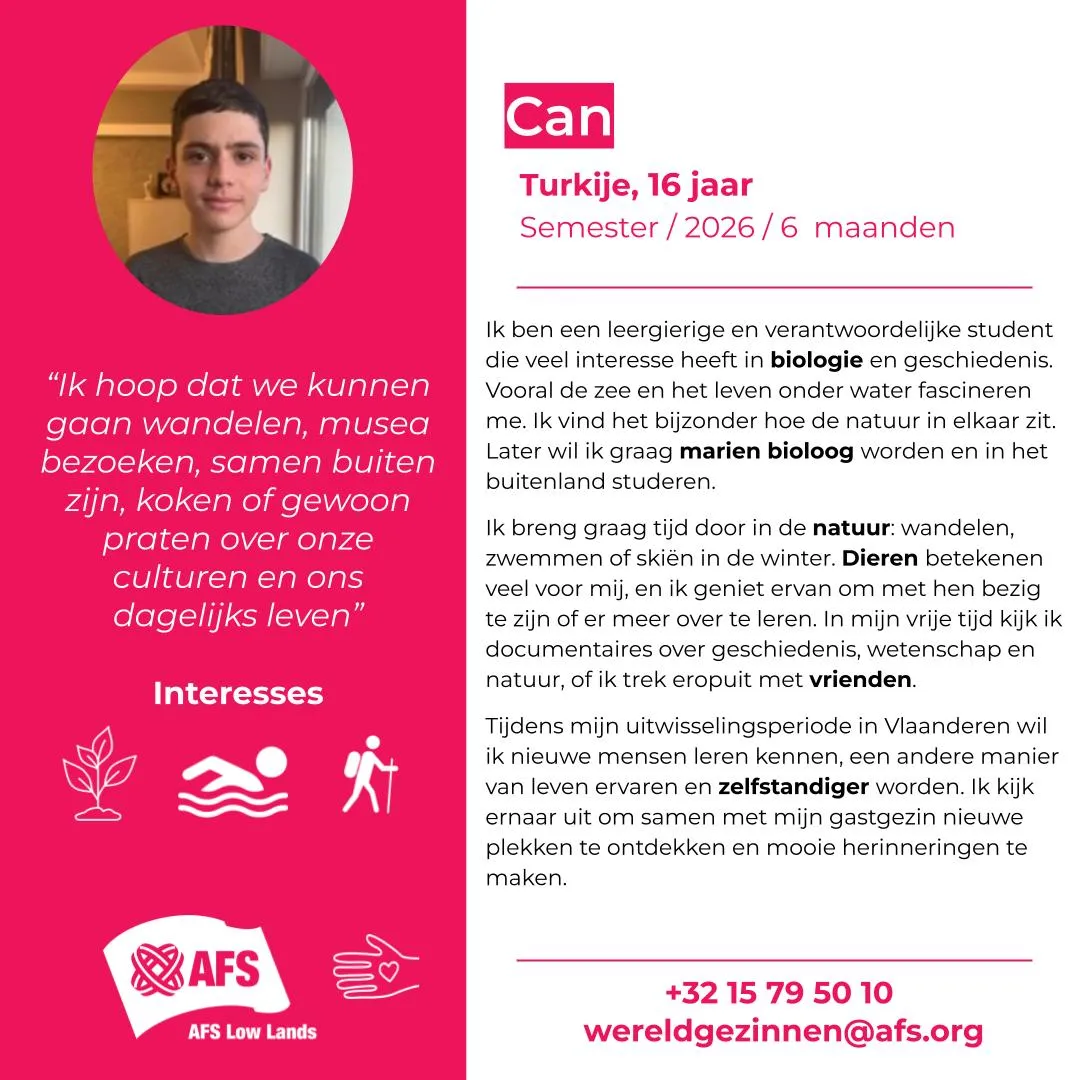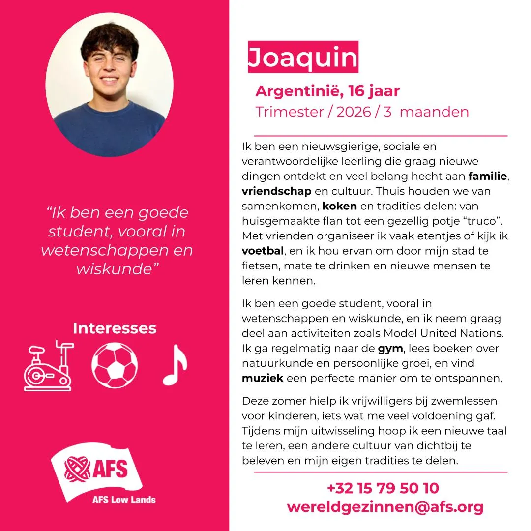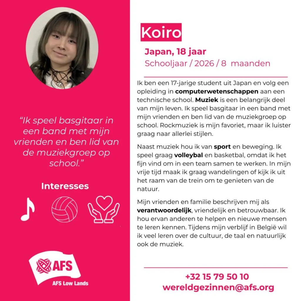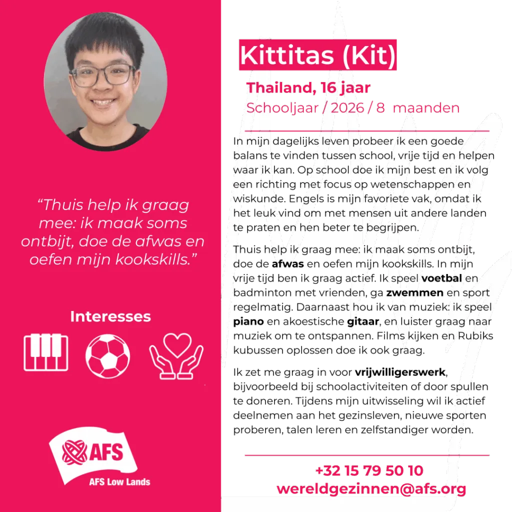 Enthousiast geworden? Neem contact op met het AFS-kantoor in Vlaanderen via 015/79 50 10, [email protected] of ons online formulier: