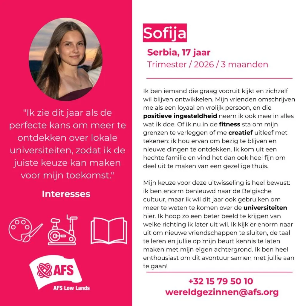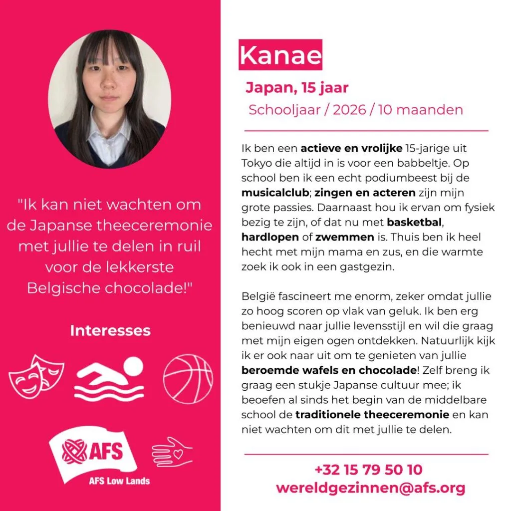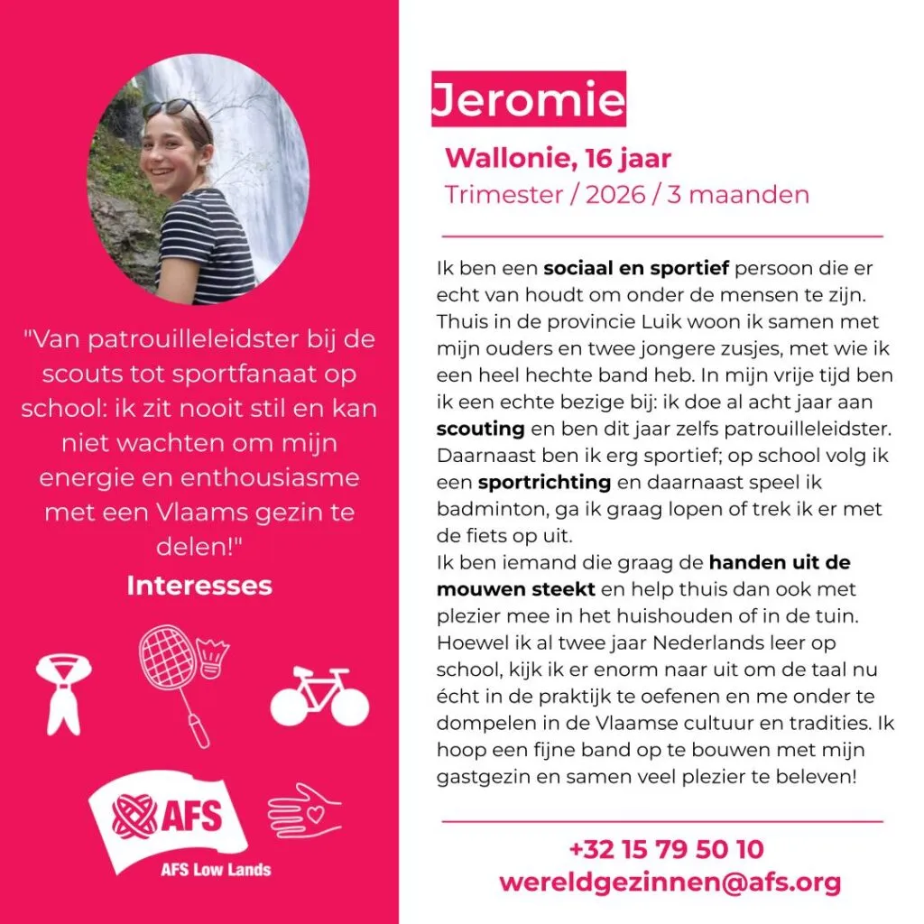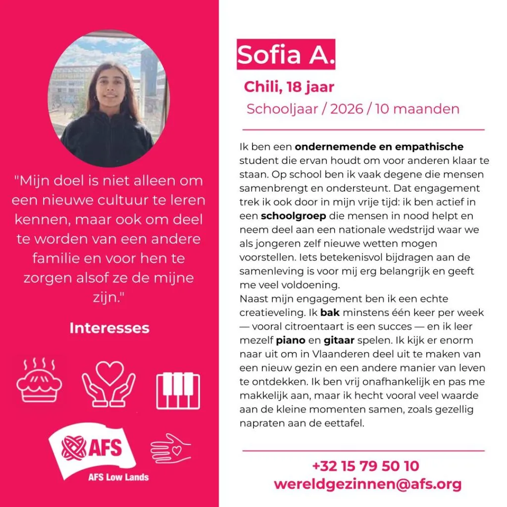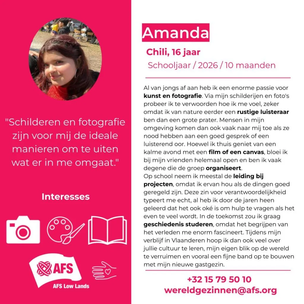 Enthousiast geworden? Neem contact op met het AFS-kantoor in Vlaanderen via 015/79 50 10 of [email protected].